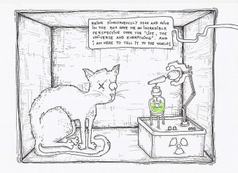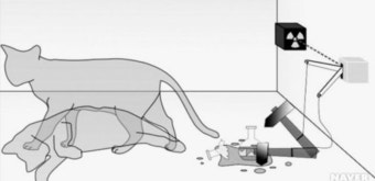 - 방사성 물질이 붕괴하면 계수기가 이를 감지해 독가스를 방출하고, 고양이는 죽습니다.